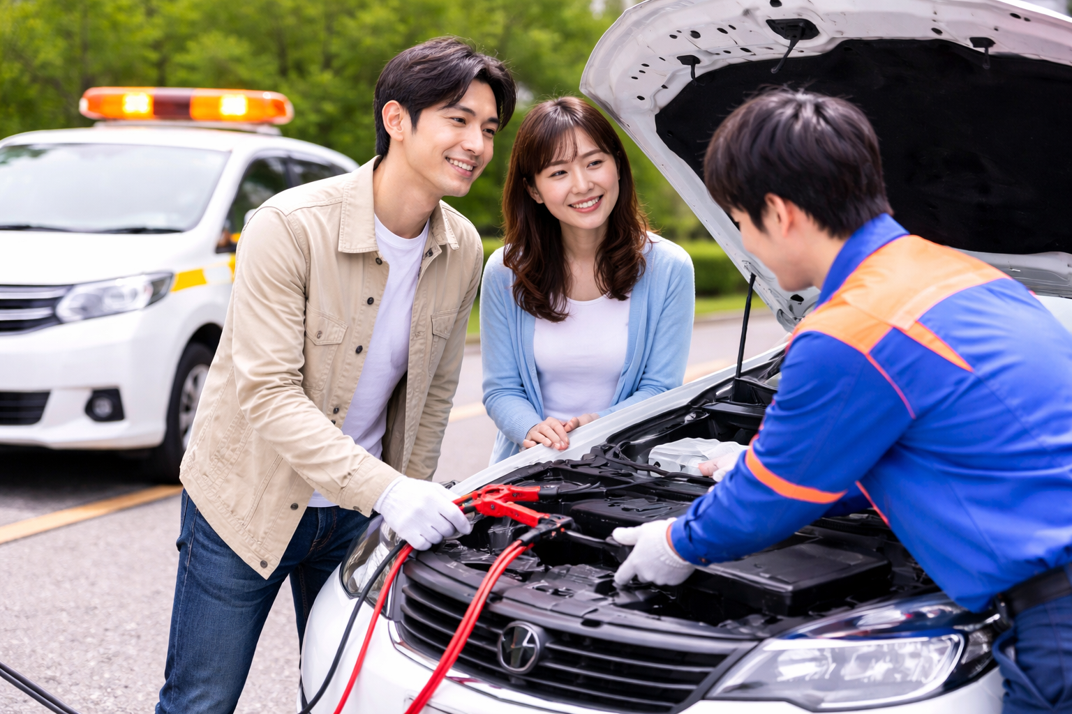 外出先で道具がない場合や、接続手順に不安がある場合は、ロードサービスを利用するのが現実的です。