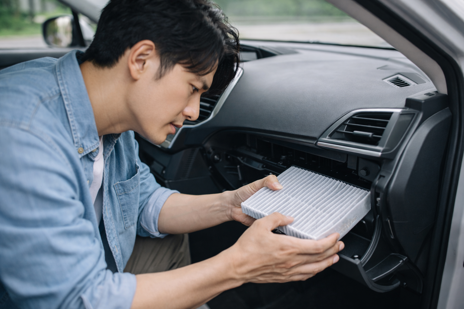 エアコンフィルターは、車外から入るほこりや花粉などを取り除く役割を持つ部品です。汚れがたまると空気の通りが悪くなり、風量低下につながることがあります。