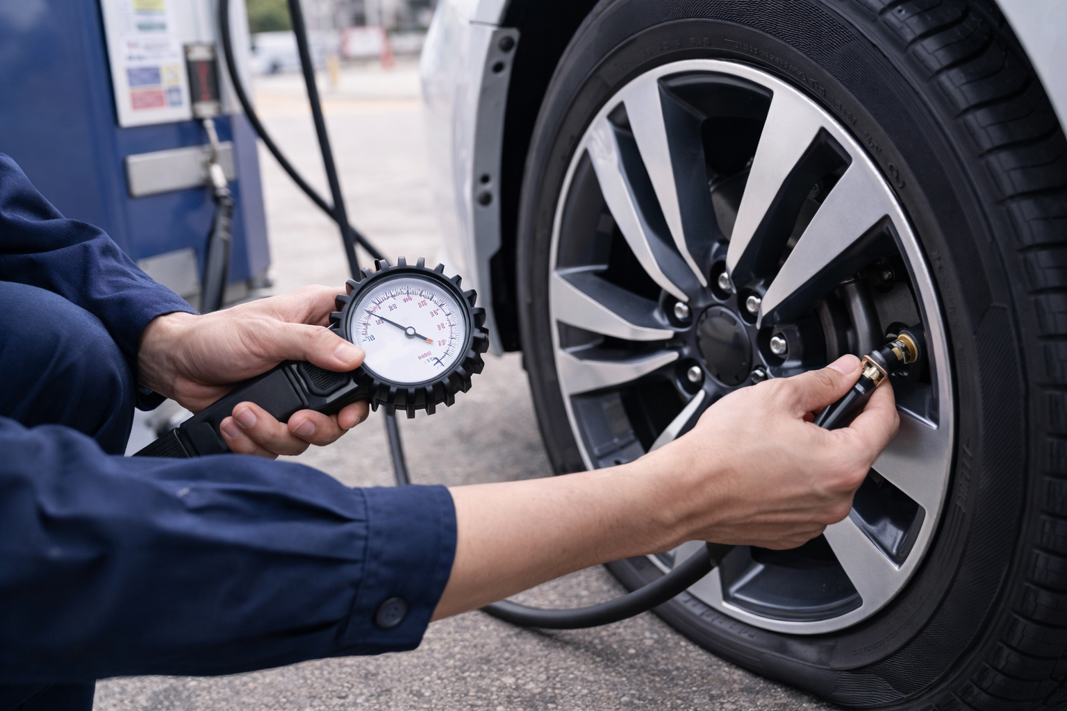 大きな異常がなさそうなら、ガソリンスタンドなどで空気圧を点検します。空気圧はエアタンクやゲージで確認し、指定値に合わせて調整します。