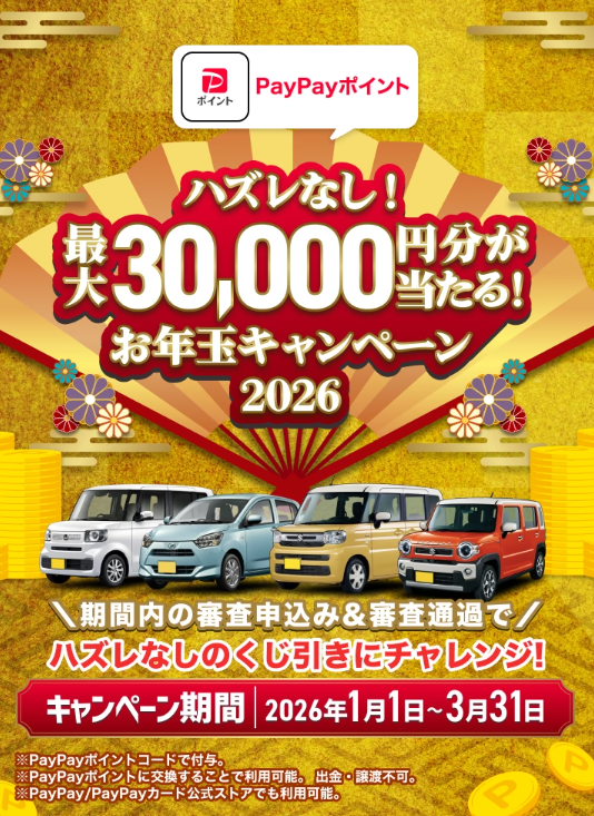 なお、2026年1月1日~3月31日までの期間中に初めて審査に申し込み、審査に通過された方に最大3万円分のPayPayポイントが当たる「お年玉キャンペーン2026」を実施中です。