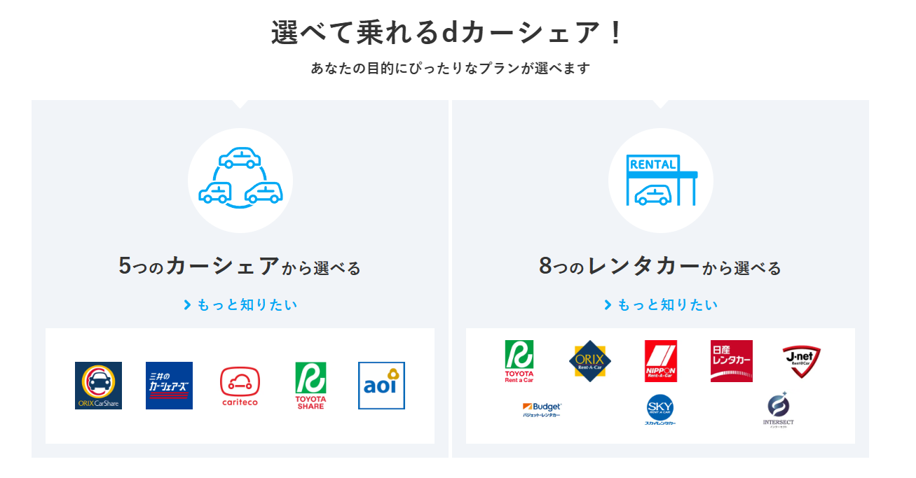 dカーシェアは、5つのカーシェアサービスから利用する車を選べることが大きな特徴です。