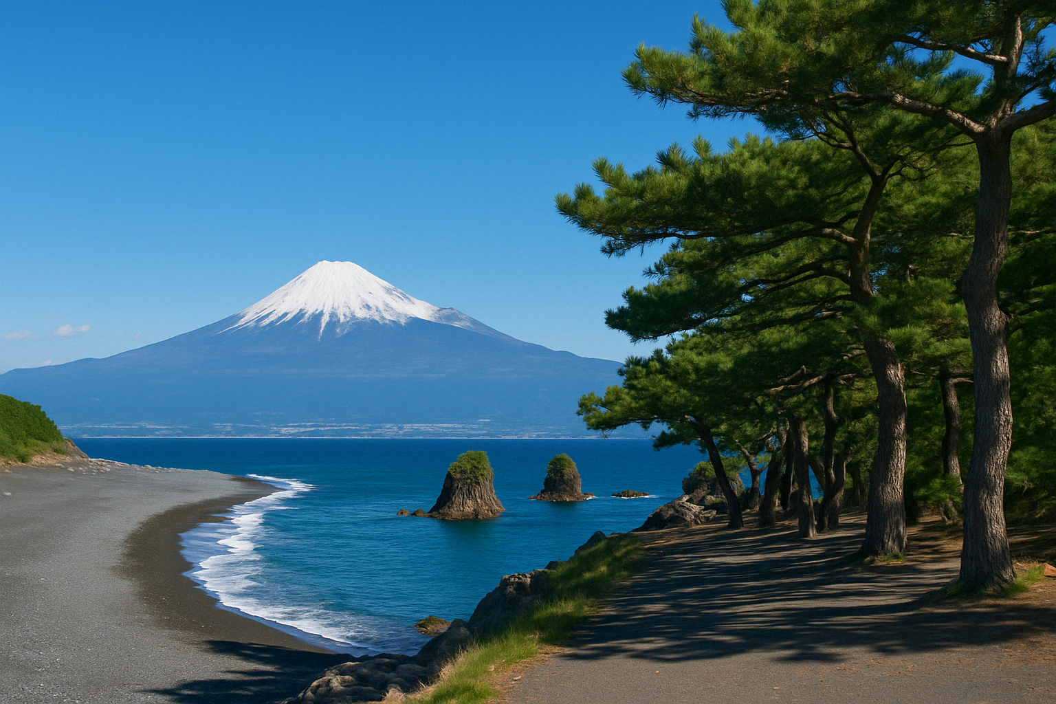 静岡市清水区に位置する三保の松原は、世界文化遺産「富士山―信仰の対象と芸術の源泉」の構成資産のひとつとして知られています。海岸線に松並木が続く風光明媚な景観は、季節や天候に応じてさまざまな表情を見せてくれます。車があれば清水港や日本平など周辺の観光スポットにも立ち寄りやすく、短時間でも充実した観光が楽しめるでしょう。