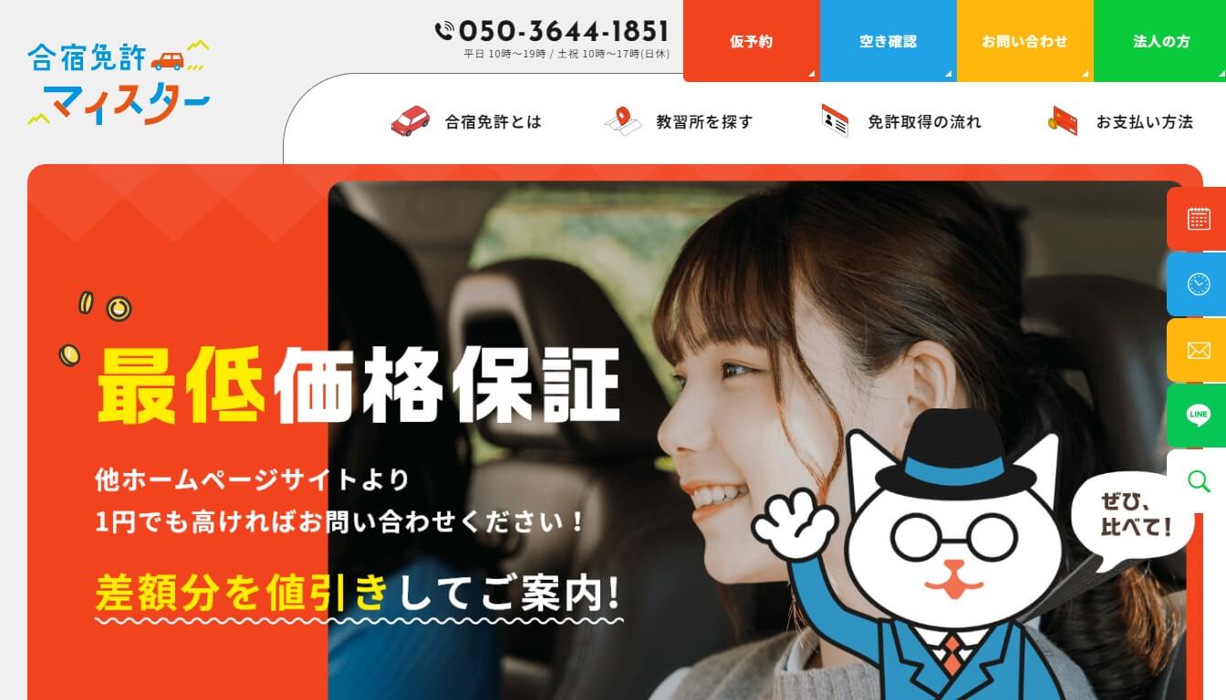 おすすめ合宿免許料金の安いランキング1位は、合宿免許マイスターです。