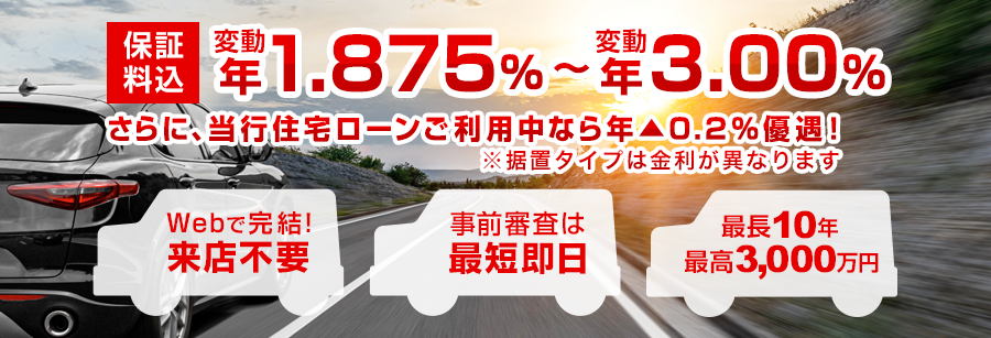 年利 年1.875%~年3.00%(※同行住宅ローンを併用し0.2%引きになった場合、最低金利は年1.675%)