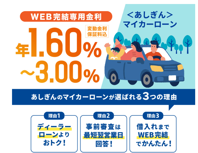 | マイカーローン名称 | ・あしぎんマイカーローン「アポインと」 ・借換専用マイカーローン |