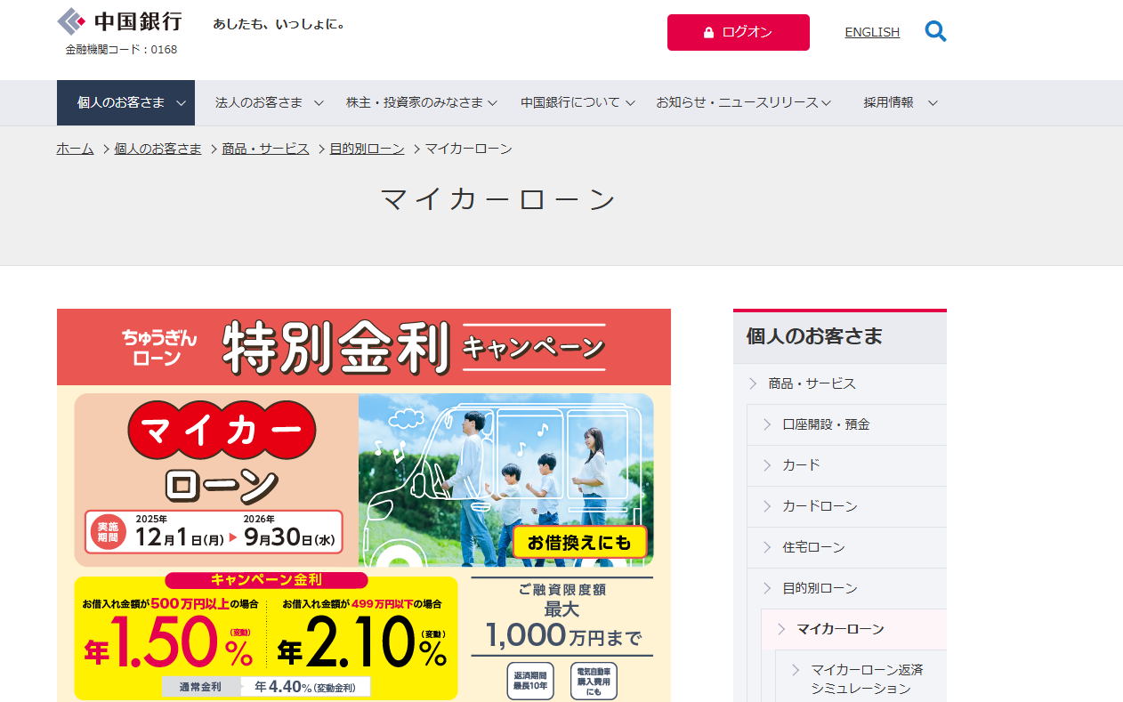1,000万円 | 要問い合わせ | マイカーローン |