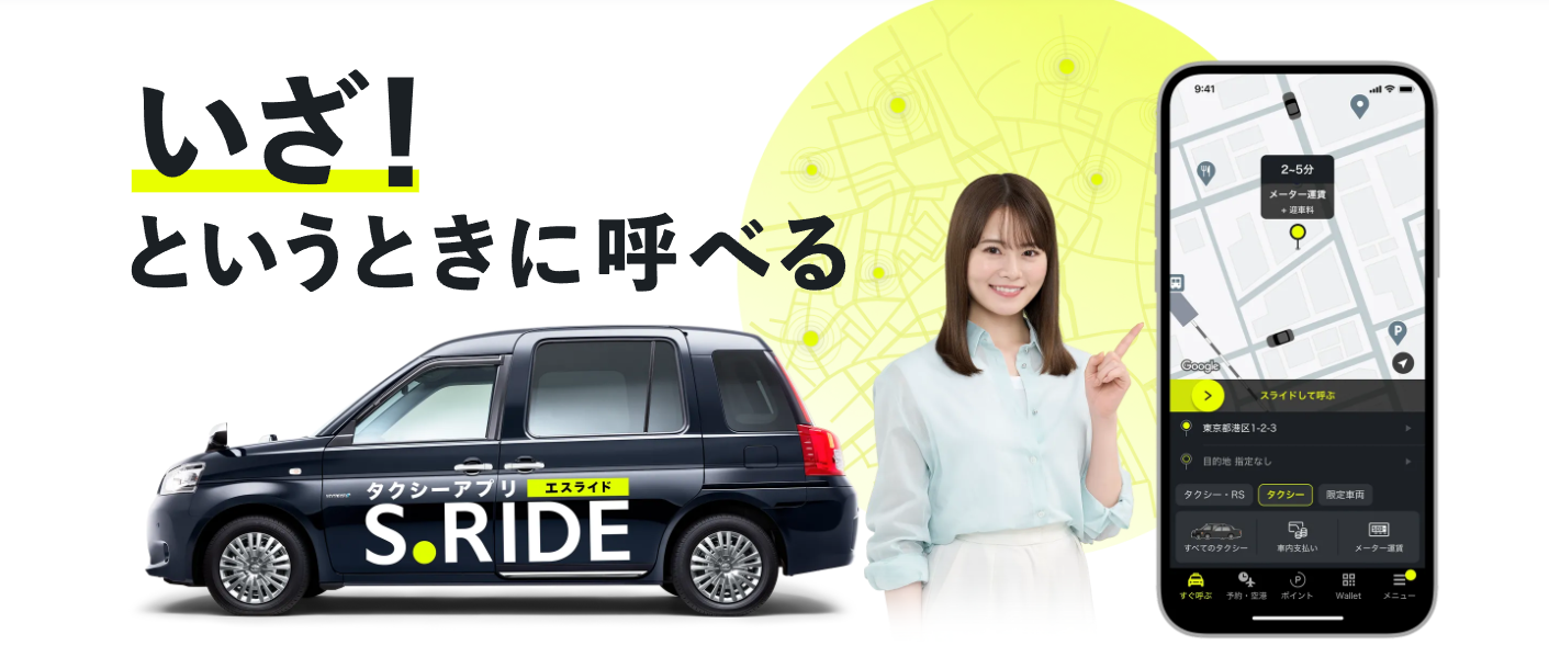 S.RIDEは“ワンスライド”で配車が完了する、東京最大級のネットワークを持つタクシーアプリです。