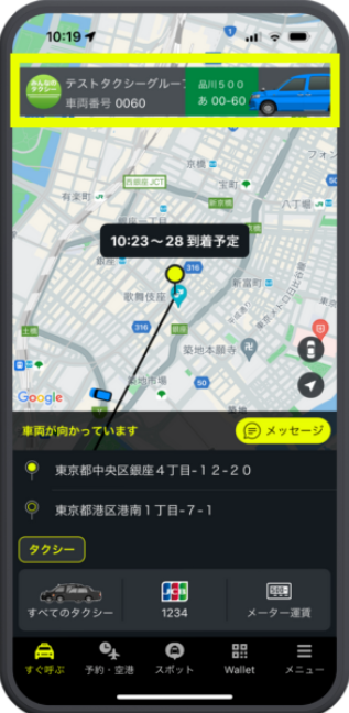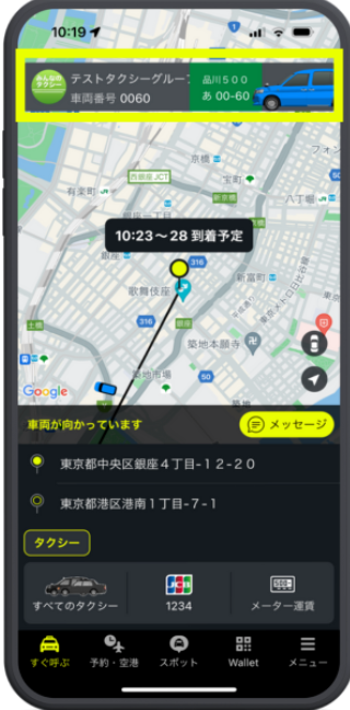 車両が見つかったらアプリ上にタクシー会社名・車両番号・車両カラーが表示されます。