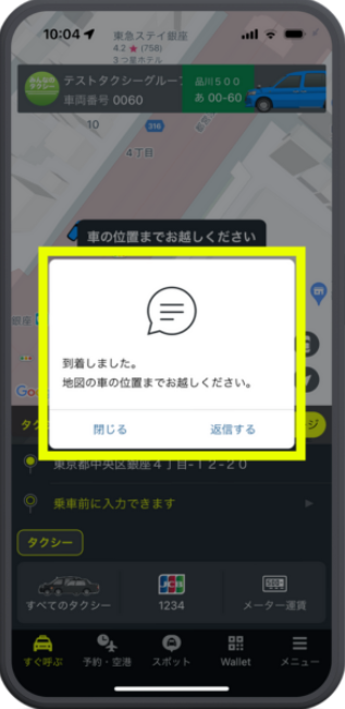 車両が到着したら現着連絡がアプリ内通知にて届きます。