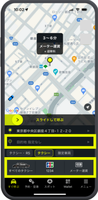 必要に応じて画面下部の目的地・運賃種別・支払い方法・クーポン選択・車種指定・会社指定などの設定も可能です。
