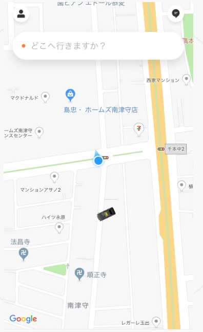 S.RIDEアプリを起動すると自動で現在地から一番近い道路沿いに黄色いピンが設定されます。