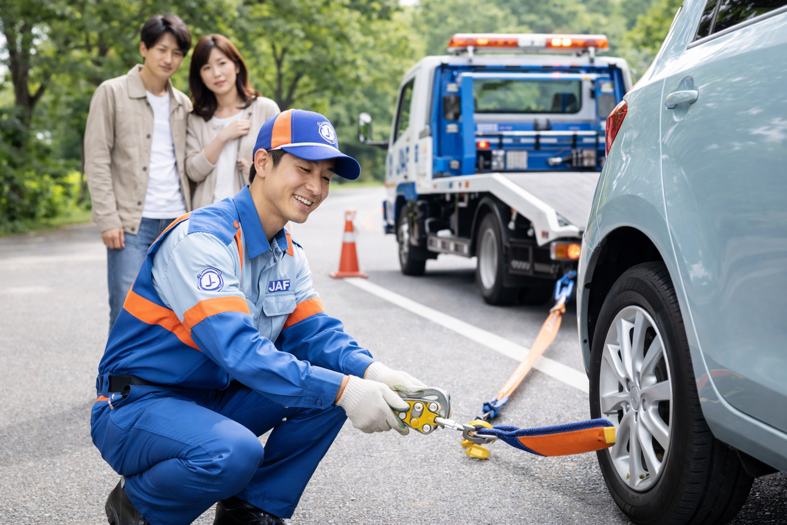 JAFのロードサービスでは、車のトラブルに対して現場で対応してもらえるのが特徴です。主な対応内容は次の通りです。